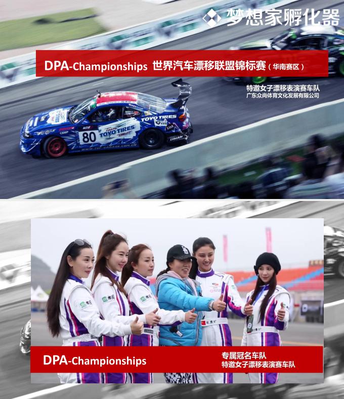 DPA世界汽车漂移-拥有国际车手数百名资源,旨在引领中国汽车飘移运动在世界的发展,计划在中国举办10场左右的大奖赛和一些景点定制项目,并发展汽车飘移俱乐部和培训,配套有国家体育总局和文化部等政府资源的支持。