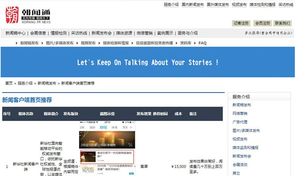 不能缺少的是对客户服务体验的关注。作为新闻稿发布机构,业内能认真关注用户体验的似乎不是很多。而为平衡好客户和新闻发布平台的之间的关系,朝闻通也是不断摸索。甚至在网站内,客户就能提前清楚各个网站的发布请求,这一举动既帮助客户充分了解新闻,及时选择到合适网站,也让自己的企业信誉得到了很好的保证。据悉,并不是每个新闻稿发布的机构都能如此“坦率”,做到明码标价,绝对不吃回扣的。