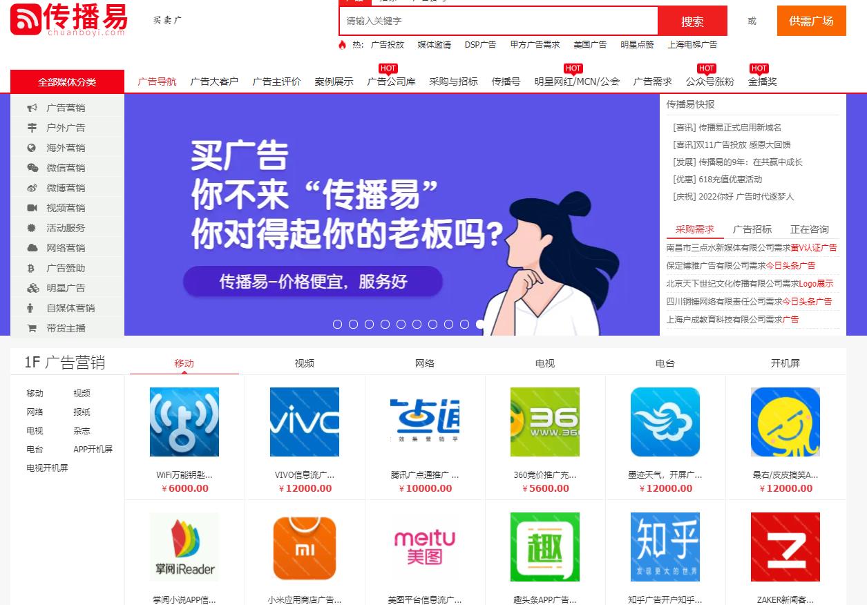 传播易广告平台(chuanboyi.com)是一家专业的互联网广告交易平台,拥有9年历史,为客户提供从广告投放到结算及数据管理等全程服务。这也是中国最早一批正式上线运营的第三方交易平台。