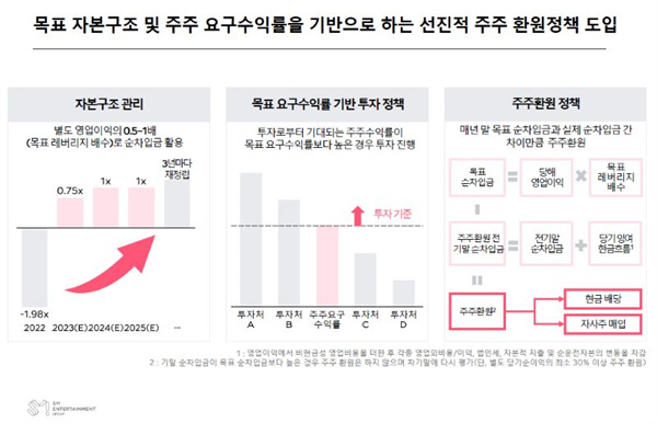 另外,SM娱乐通过收购外部厂牌及设立音乐发行专门子公司,扩大IP制作能力的同时,▲以另外营业利润的0.5~1倍(目标杠杆倍数),利用净入账的资本结构管理▲从投资中期待的股东收益率高于目标要求收益率时,进行投资的目标要求收益率基础投资政策▲设定目标财务结构(维持相当于另外营业利润0.5~1倍的纯现金),以此为基础计划将剩余现金用于股东回报,通过SM 3.0战略的5大方案,计划切实履行实现“以粉丝和股东为中心的全球娱乐公司”这一飞跃。