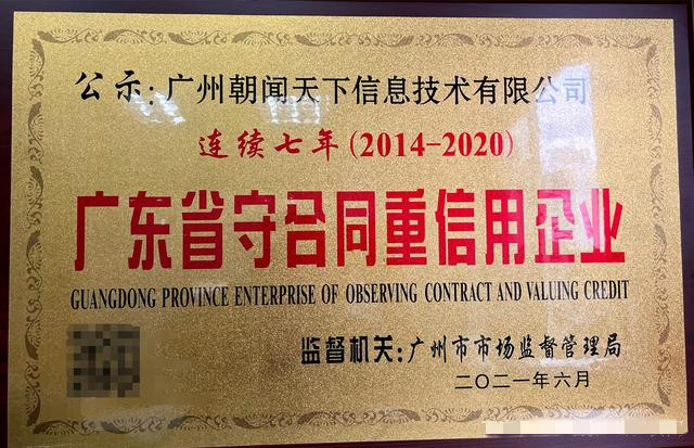朝闻通在广东省广州市市场监督管理局审核通过后,被授予“守合同重信用企业”荣誉证书。朝闻通......